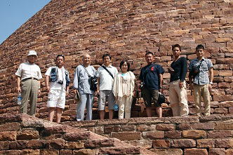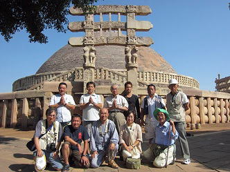 | 今回のインド訪問の主目的は『釈尊の墓参』にあります。 いよいよ胸躍るお釈迦様のお墓への御参りが叶う時がやって来ました。 バスの中で、御参りの次第を解説させて頂きました。 良く晴れたサンチの丘に釈尊のお墓である第一スツーパと第三スツーパが見えました。 念願のスツーパを前にして涙も溢れます。 阿育王の建立した二千年前の供養塔が目の前なのです。 写真では判りませんでしたが、目前にして判りました。 土饅頭型ですが、八角で囲まれた中に有るのです。 目の前の北門の彫刻が精緻です。 強烈なスコールに耐えて全く風化摩耗が感じられません。 進入路の関係で北門から読経供養を勤める事にしました。 導師を福原が勤めます。 三礼、懺悔文、発願文、開経偈、般若心経、観経文、宝号、回向文、念佛、念仏回向偈を 全員で読誦しました。 続いて、京都と長野から持参の水で、洒水の儀を執り行い、全員で塔前に手向けました。 気が付くと、多くの入場者が何事かと好奇の目を我々に向けて囲んでいました。 我々の厳修作法を見守っておられたのです。 続いて東門へ回って、渡辺様が導師を勤めて読経と洒水を勤め、 南門では石本様が、西門では大竹様が勤めて一周しました。 南門から遶道へ上がり時計回りに二巡します。 右遶三匝と言いまして、右回りに三度巡拝するのがインドでの最高の礼法であって行道なのです。 下で一巡しましてので遶道二巡すれば三度巡拝した事になります。 建立されて2200年ほど経ちますこの塔に、 多くの善男善女が巡拝されたであろうこの道を、我々もかみしめながら廻りました。 あア、これが正しくお釈迦様のお墓なのです。 仏教遺跡来訪も大事ですが、お墓こそが大切なのです。 仏道者として、生業を墓石に勤しむ者として、お墓への巡礼こそ悲願であり必須なのです。 四門の彫刻の解説をして頂き、今さらながら人類の見事な世界遺産に驚愕の連続で有りました。 菩提樹やスツーパ供養、仏伝などの物語彫刻が見事です。 柔らかそうな砂岩が2000年も風化摩耗する事無く残されている事が不思議です。 私の装束の作務衣と輪袈裟が珍しいのか、大勢の人が「一緒に写真撮影を撮ってください」と寄って来ます。 驚きました、次から次と乞われるのです。 まるで映画俳優気取りです。 「何処から来たのか?」「有名な僧侶なのか?」と矢継ぎ早な質問です。 すっかり、日印民間交流が出来ました。 インドの人は温かく親切です。 子供たちも賢そうで礼儀正しくて清潔です(此処に居た子のみ)。 直ぐ傍には第3塔が立っています(第2塔は少し離れる)。 この塔中から舎利弗と目?連の遺骨が発見されています(釈尊の遺骨は未発見)。 塔門の彫刻は立派に尽きるが、肝心で主たる物はドーム型をした『覆鉢』なのです。 これがお釈迦様のお墓の本体なのです。 この呼称のスツーパが、漢訳されて卒塔婆となり、省略されて塔婆とか塔と言われた、その語源なのです。 お釈迦様を表す物として、このスツーパが付け加えられているのが三重塔や五重塔の相輪部分の覆鉢なのです。 墓地で見る、覆鉢の欠落した宝篋印塔や多宝塔の相輪を見るにつけ、 間違って施工を済ませて平気で恥知らずな業界のレベルアップを願わずにはおられません。 お釈迦さまをお迎えしてこそが仏塔なのですから、覆鉢あればこそ成り立つ物なのです。 近くにサンチと同じ時期に建てられて近年発見され修復が完成したスツーパが有ると言う事で、 車をバスから乗用車に乗り換えて悪路を進みました。 ジャングルの中に忽然と仏塔群が現れました。 サダーラ仏塔群です。 そのうちの一基が特に巨大ですが、旧来の塔に新しき煉瓦で葺き直しています、 綺麗と言えば綺麗ですが古式の則った感が有りません。 やはり、取って付けた感が否めないのです。 阿育王の故事によれば、インド全国にこう言ったスツーパが84千基も立てられていた事でしょう。 未開のジャングルの中からこのような仏塔がまだまだ発見される事でしょう。 ボパールからブザワールまでは23両連結の寝台列車での移動です。 4人一室のような寝台です。 列車内ではアルコールは禁止ですが、 誰かが持ち込んだお酒で宴会です。 車掌が通るたびに隠しています。 一眠りをした夜中の23時半に起こされて下車です。 降りた駅舎の陰で一斉放水です。飲めば出すの自然現象です。 バスに巣に揺られて25時にチェックインと成りました。 『観光旅行だったら怒るで、研修旅行だから許せるけど』とは、陰の声です。 明日のアジャンタ石窟訪問の為の近くの田舎のホテルです。 |