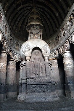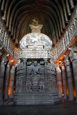 | アジャンタ石窟寺院は仏教設備が残された遺跡です。 少し歩かなければなりませんので、駕籠かきや物売りが大変しつこいのです。 何人かは駕籠(千ルピー)に乗りましたが、思い熱き人は歩行軍です。 9窟と19窟と26窟には大変巨大で素晴らしいスツーパが残っています。 仏教の創成期には仏像って言う物が有りません。 代わりに、スツーパや菩提樹がお釈迦様の代替わりを勤めました。 16窟の尊前で長野県の渡辺様と兵庫県の大竹様とで手を合わせておりますと、 インド人僧侶が立ち入り禁止の鎖を持ち上げて手招きで中へ入れと促しました。 直前まで入れて下さったのです。 思わぬ行為に感激をして御尊前で声を大にして三人で般若心経を唱えました。 石窟内ですので、大きく反響をして荘厳裏に響き渡りました。 感謝の思いを込めて、僧侶に御布施を差し出したのですが、丁寧にお断りなさいました。 本当の僧侶のお姿に触れた感じがし、更に感銘致しました。 石窟は彫刻が素晴らしく、感動感銘の連続です。 物売り集団は、日本語が上手で愛想よく、 「中村さん」や「後で買ってくれる?」と、楽しい人たちばかりです。 ついつい私もガイドブックを300ルピーで買ってしまいました。 礼拝対象が、菩提樹からスツーパになり仏像に変化して行った流れが描き示されていて勉強になりました。 街は人であふれ、寝転がっている人が大勢いますしごみが散乱していて汚れています。 バラックの様な家に、何もしない男達であふれています。 何を考え、何をして喰っているのでしょうか?。 女性の姿も見られません。 ミゼットのような小型自動車がひしめき、バイクは3人か4人乗っています。 ルールもマナーも無いようでしきりに警告音が鳴らされてうるさい事。 バスのドアーも開いたままです。 信号も有りませんし、全く各自の自由走行ですが、事故の現場を見た事もありません。 今日の泊りは、初めての高級ホテルです。 今まで、ゆっくりと宴会らしきものをしたことが無いので、 今宵こそはガーデンにて結団式並びに解団式となる宴会に興じたかったのですが、 石本様が下痢、大竹様が風邪でダウン。 ターバンを巻いたインド人医師を呼んで診てもらう事になりました。 診察と投薬で、一晩寝たら治るでしょう。 乾杯の発声を、仏教墓塔研修会恒例の若手に依頼をしての20歳で参加の坂口様です。 勢いある若さのパワーを頂いた発声に唱和して『乾杯』。 芝生の上の舞台ではインド女性のダンスや音楽が興じられています。 インド料理ってカレーを代表する辛い物ばかりと思っていましたが、 なかなか、気に入ってしまいました、美味しいのです。 特に、ガーリック味のナンは『美味しい〜』。 ホテルの売店で、 高栖の社長が奥様に宝石の指輪をプレゼントしておられました。 |